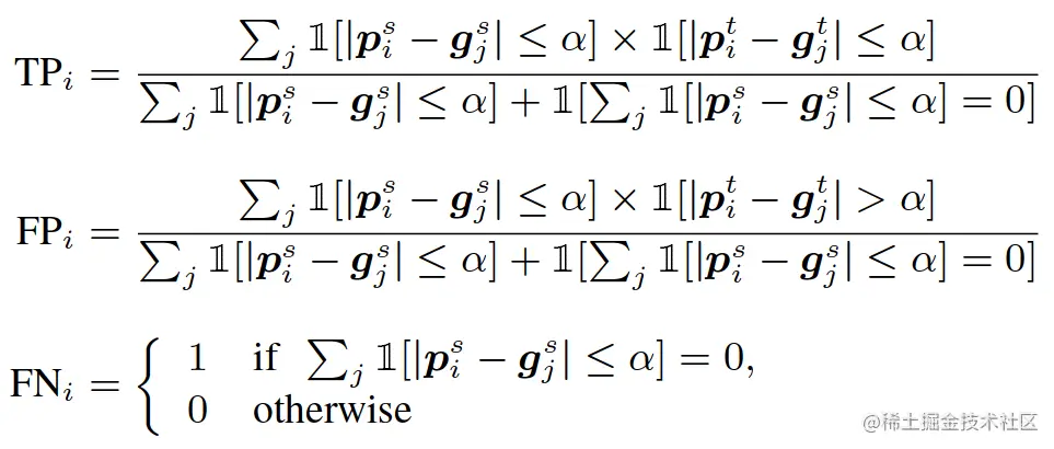 与目标检测类似,我们引入了一种基于精度召回的具有平均精度 (AP) 的度量。我们假设每个预测的对应关系都有一个置信度,我们将其定义为这项工作中成对框置信度的乘积。这允许我们通过定义真阳性 (TP)、假阳性 (FP) 和假阴性 (FN) 来计算精度和召回率。 由于PASCAL 3D+ 只提供稀疏的对应基本事实,这里的挑战是正确地忽略一些远离任何基本事实但正确的对应预测。为此,我们遵循关键点传输设置,我们始终为任何成对对象定义源端 s 和目标端 t。给定一个基本事实(gjs;gjt),一个预测对应(pis;pit)和一个距离阈值α: