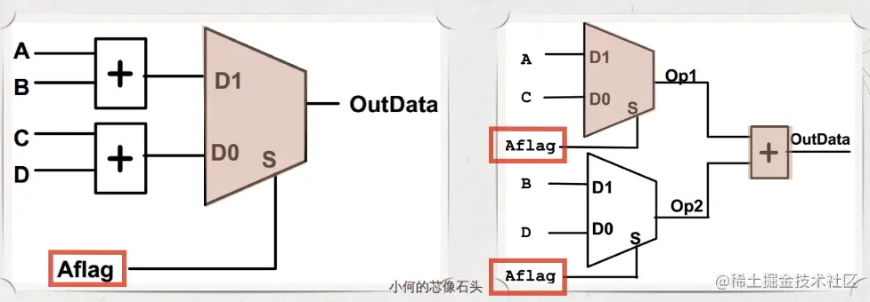 trade-off:但是在这种情况下,电路的传播延迟 -> 数据通路的延迟没改变,但是控制通路的传播也变成了一个选择器和加法器之和,如果aflag到来延迟晚,则后一种电路没前者好的性能没这么好: