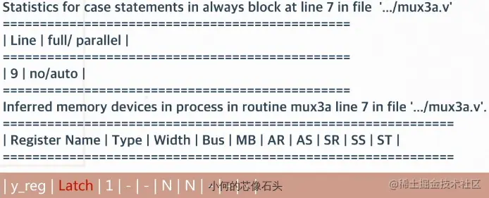 - 仔细检查综合器生成的报告,latch会以warning的形式报告
