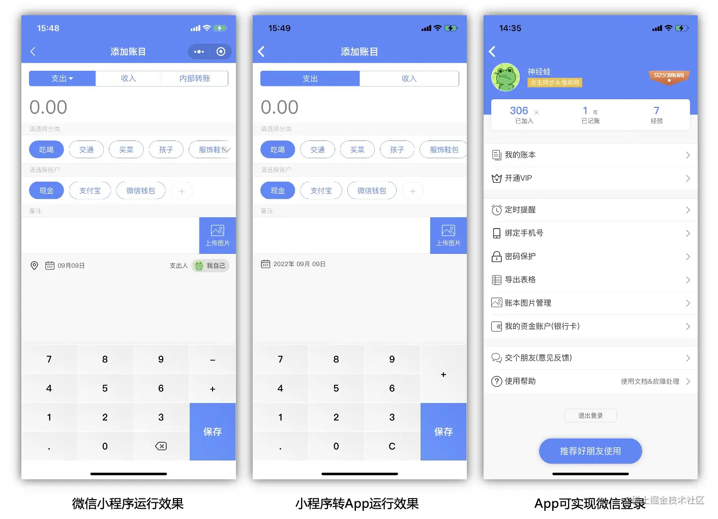 作为一个规模较小的团队,在技术工程师和成本预算都不充足的前提下,共享记账借助 FinClip 兼容微信小程序语法的特性,将已在微信运行的记账小程序转为 App,整体的体验度和微信端的差异不大。但整个开发过程仅需要一名人员即可基于 FinClip IDE 工具的“小程序转 App”完成整个过程,甚至 App logo 、开屏动画、权限配置等操作都能在工具中以勾选的方式完成。