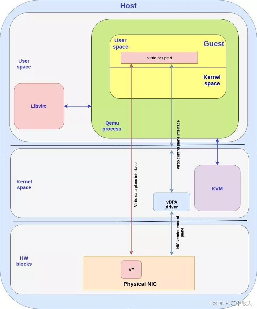 从下图中可以看到virtio的控制平面仍需要vDPA driver进行传递,也就是说QEMU,或者虚拟机仍然使用原先的控制平面协议作为接口,而这些控制信息被传递到硬件中,硬件会通过这些信息配置好数据平面。而数据平面上,经过配置后的数据平面可以在虚拟机和网卡之间直通。