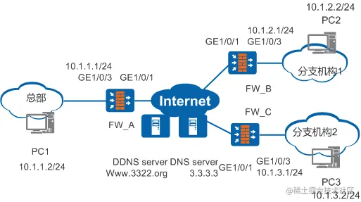- 分支机构1和分支机构2分别通过FW_B和FW_C与Internet相连。