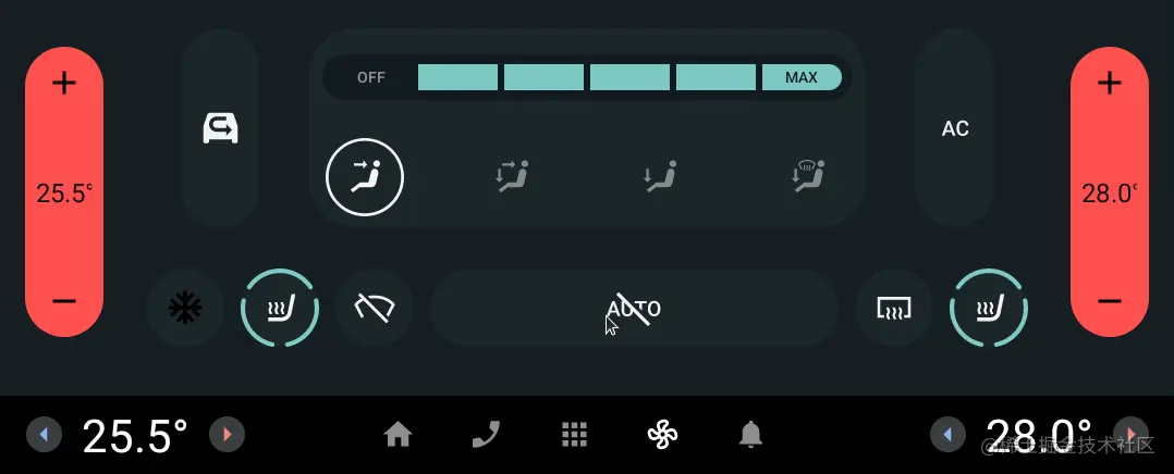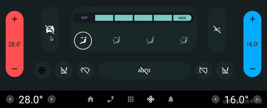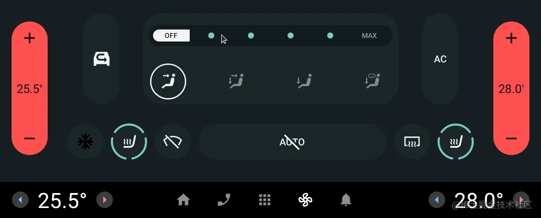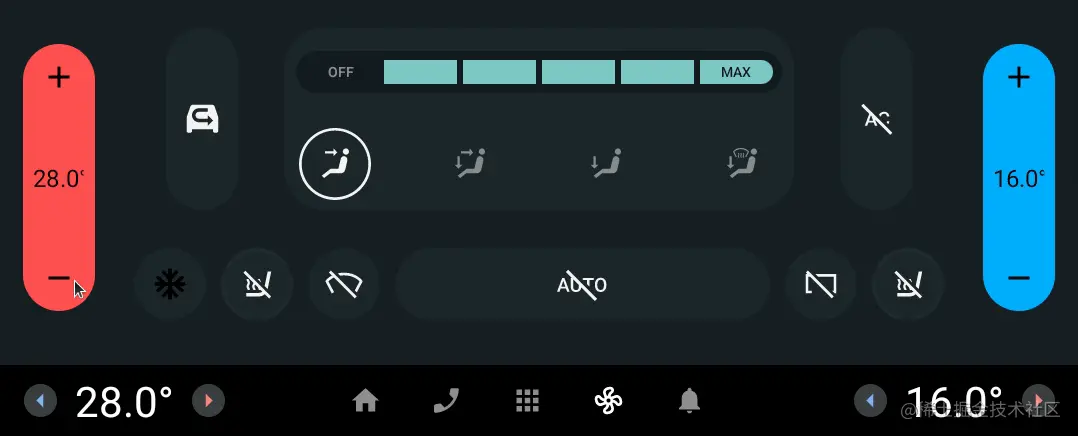 以上就是车载空调部分的讲解,实际开发中,空调模块功能性需求一般不会出现什么太大的技术性困难,空调模块的技术性难度几乎都体现在复杂的动画和交互上,有关车载应用的复杂动画技术,我们以后在来细讲解决方案。