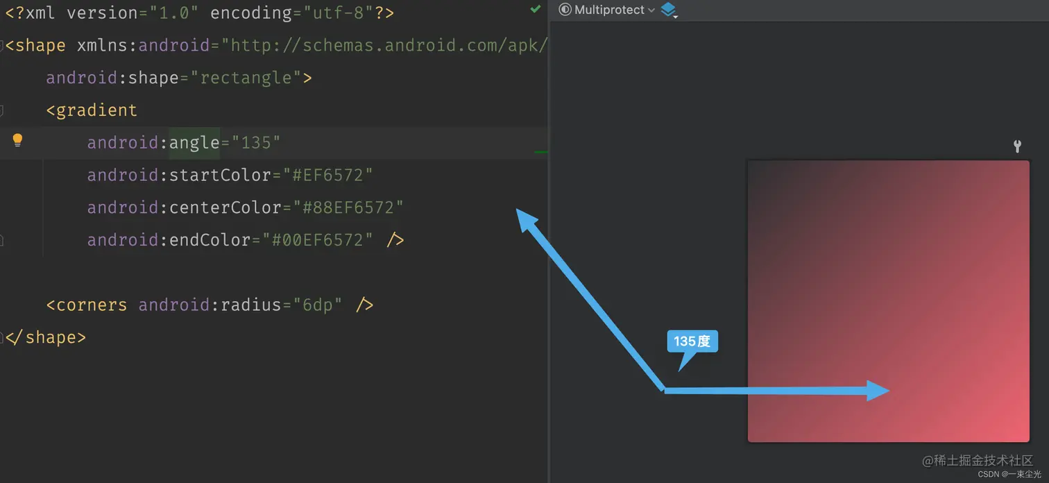 注意:angle只在线性渐变下使用,而且有效值只有0, 45, 90, 135, 180, 225, 270, 315这几个,也就是0~315之间45的倍数,设置为其他值不生效,相当于设置的270度。如果需要其他角度的渐变,就需要利用自定义视图来实现了