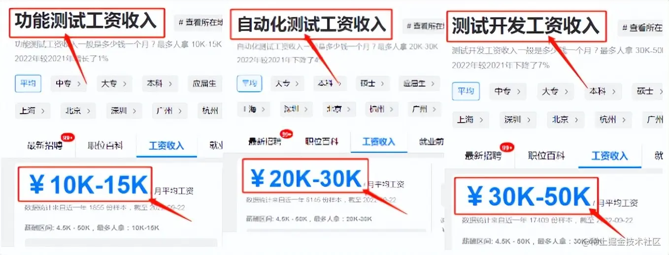 根据近一年的样本统计,自动化和测开的岗位数量,是功能测试的6倍及以上,薪资也是手工测试的2-3倍。