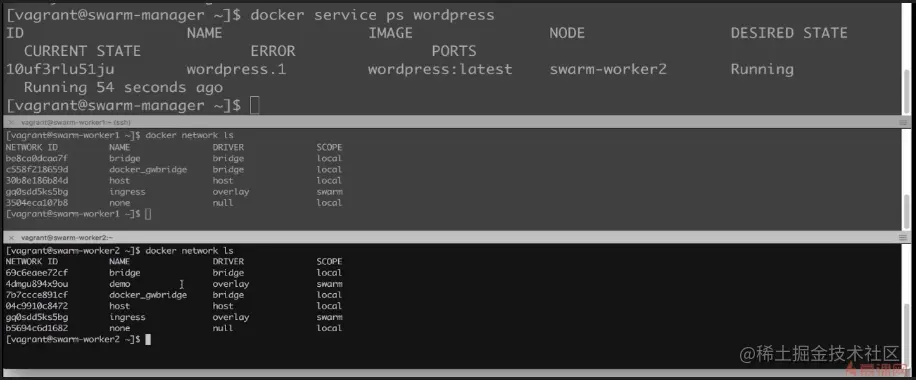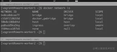 这个就是整个swarm内部处理的:当容器被分配到指定节点之后,为了保证网络同步,所以指定节点也会拥有该网络,跟之前依赖的分布式存储etcd的目的一样,只不过swarm底层机制完成了这些操作和通信,不需要再依赖了