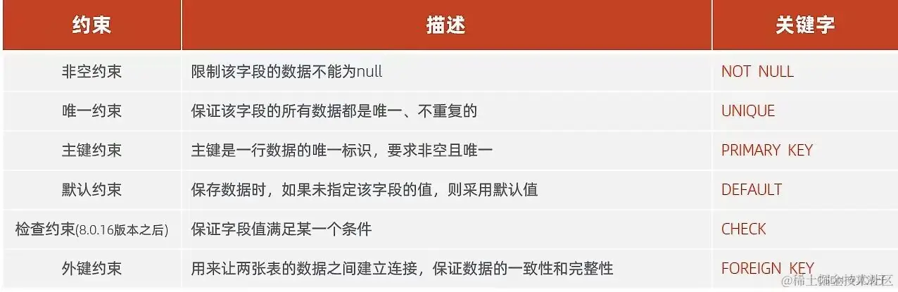 1、概念:约束是作用于表中字段上的规则,用于限制存储表中的数据