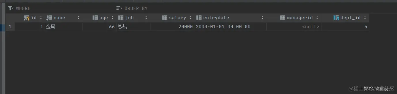 (1,'金庸',66,'总裁',20000,'2000-01-01',null,5),