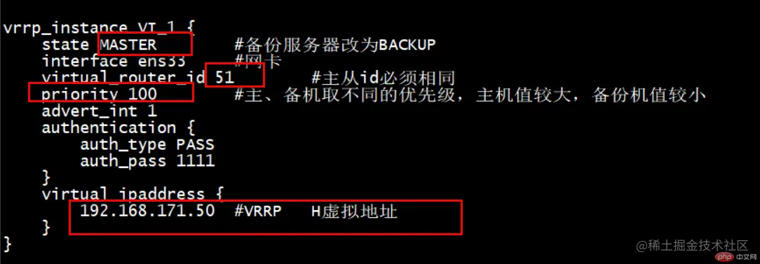 virtual_router_id 51 # 主、备机的 virtual_router_id 必须相同
