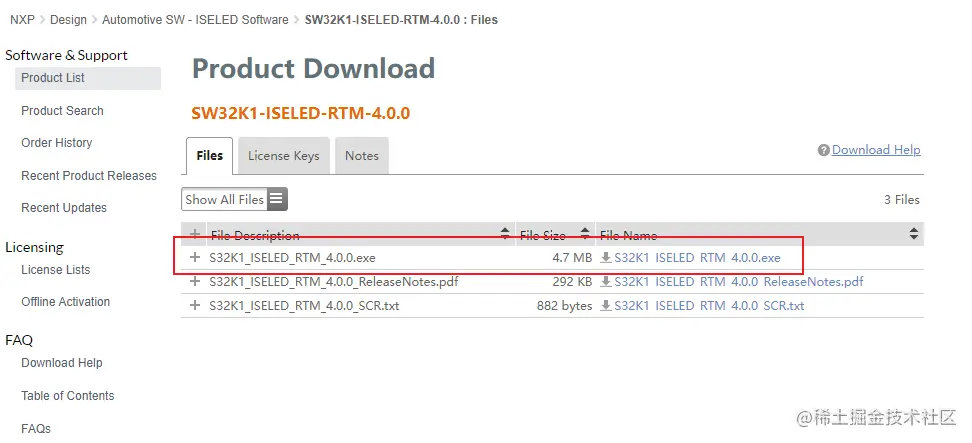 4.点击SW32K1-ISELED-RTM-4.0.0,在弹出的协议界面点击同意,会跳转至如下界面,接着点击S32K1_ISELED_RTM_4.0.0.exe进行下载,建议ReleaseNotes也下载一下,里面包含了对SDK的要求;