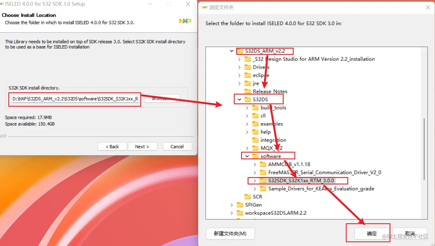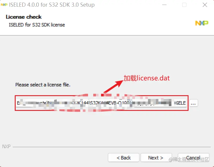 在S32DS for ARM 2.2安装好之后,双击S32K1_ISELED_RTM_4.0.0.exe进行安装,安装过程中需要加载之前保存的license文件以及选择S32DS安装目录下的S32K1xx_RTM_3.0.0文件夹,如下面两张图: