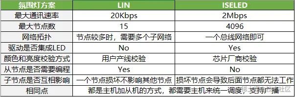 现在主流的车内氛围灯方案分为两种,一种是带自动寻址功能的LIN总线方案,代表的芯片如ELMOS的E521.31/E521.36,迈来芯的MLX81106/MLX81108,英迪芯的IND83209/IND83211。一种是使用了ISELED技术的Smart RGB LED方案(将LED Driver&Controller和LEDs封装在一起),代表芯片如统明亮的seddLED 3.0系列,弘凯光电的iCLed系列等。两种方案的对比如下表:
