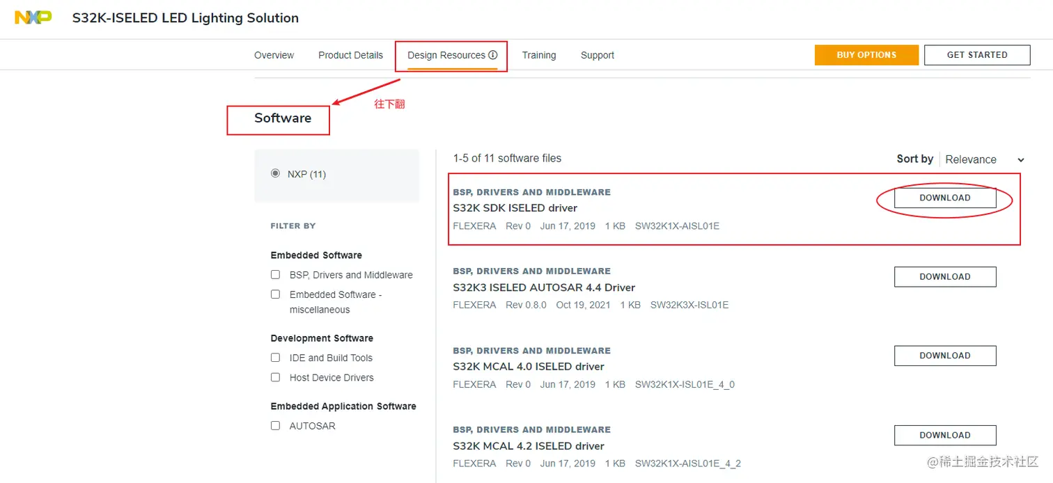 2.点击Design Resources,往下移动到Softeware,能看到S32K SDK ISELED driver的下载选项,如下图: