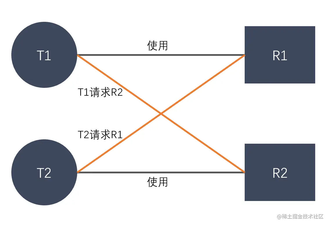 此时,T1请求R2资源的同时,T2请求R1资源。
