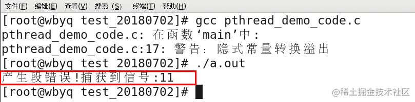 printf("产生段错误!捕获到信号:%d\n",val);