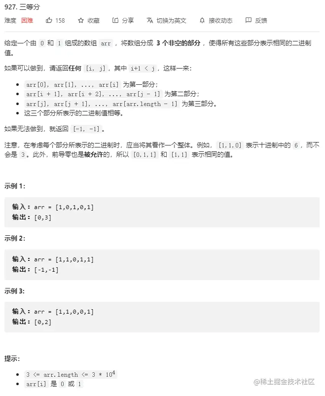 对于本题,是要求我们对 arr 数组(内容是二进制的字符,0 和 1 的序列)进行三等分,对我们的要求是三等分中的数字的二进制的值,三个等分块要相等
