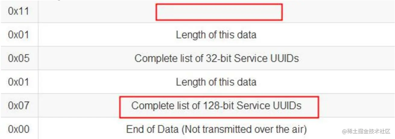 扫描响应包 ScanRspData 里 11 和 07 分别表述空白字段和 128bit UUID