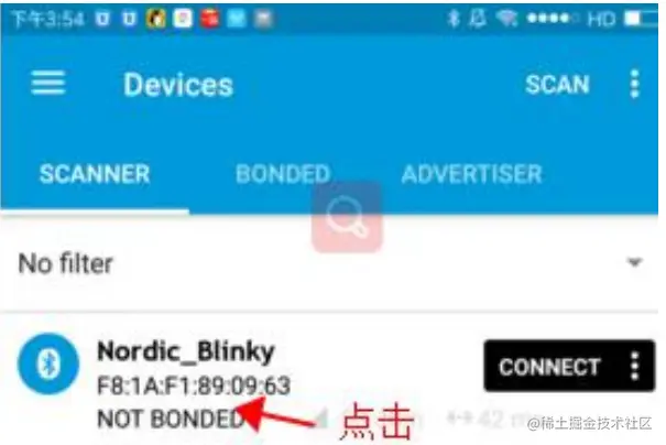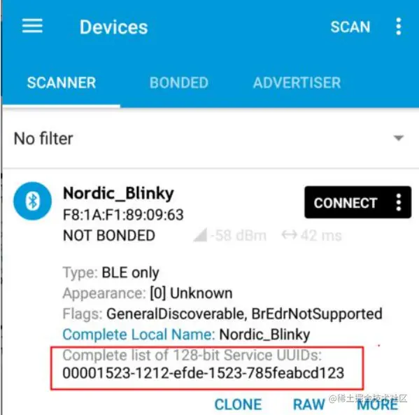 程序下载后,使用 nrf connect app 进行扫描,这个 APP 不点击连接,可以点击广播信息,实现主动扫描方式。