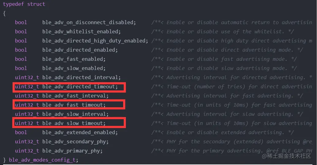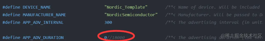 init.config.ble_adv_fast_timeout = APP_ADV_DURATION; // 广播超时时间,值0则保持一种广播模式不变