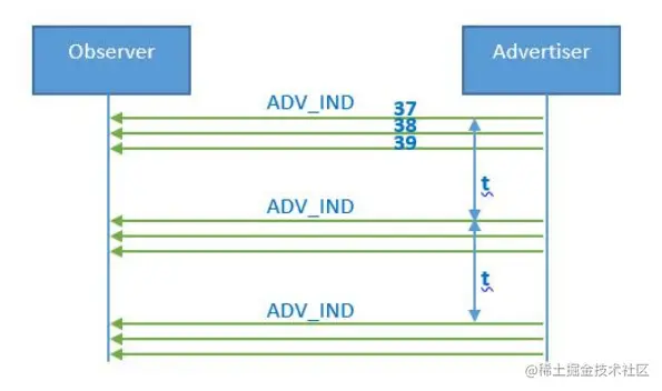 当广播发出的时候,每一个广播事件包含三个广播包,即分别在 37/38/39 三个通道上同时广播相同的信息。下图 observer 为主机观察者,advertiser 就是从机广播。
