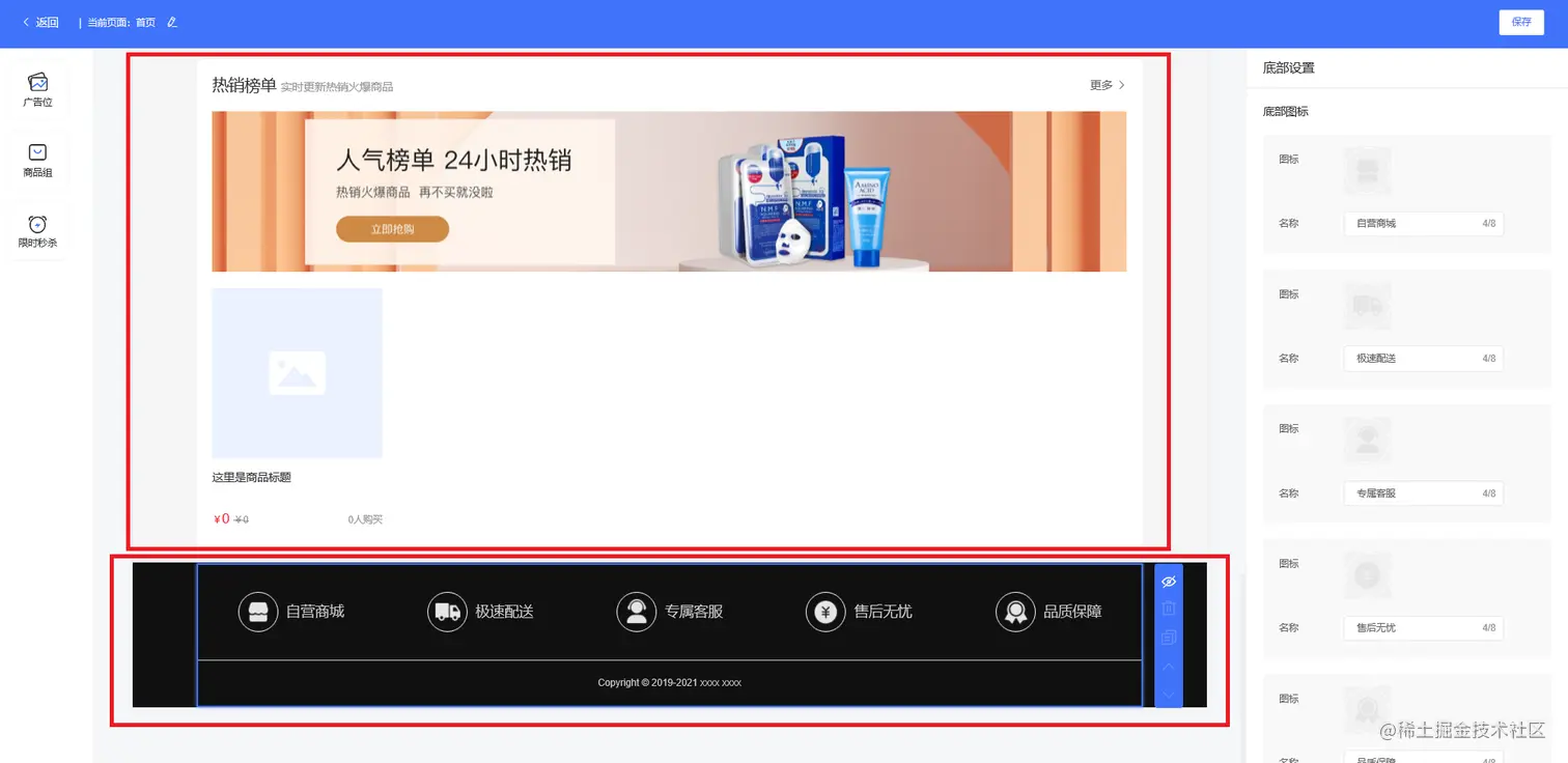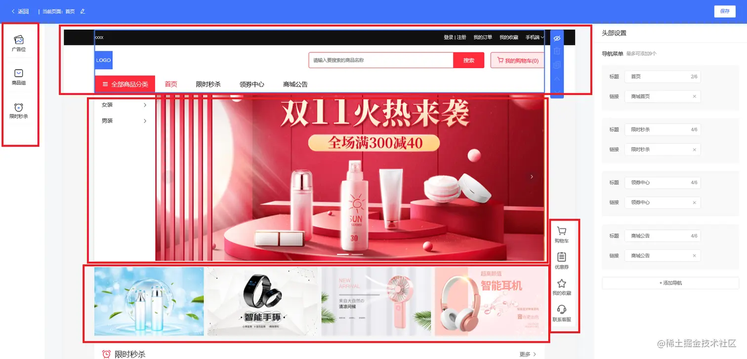 编辑首页可以对PC商城进行编辑,有头部设置、轮播图、广告位、悬浮设置、商品组、底部设置等,还可以添加广告位、商品组、限时秒杀等组件,直接拖拉拽即可,如下图所示: