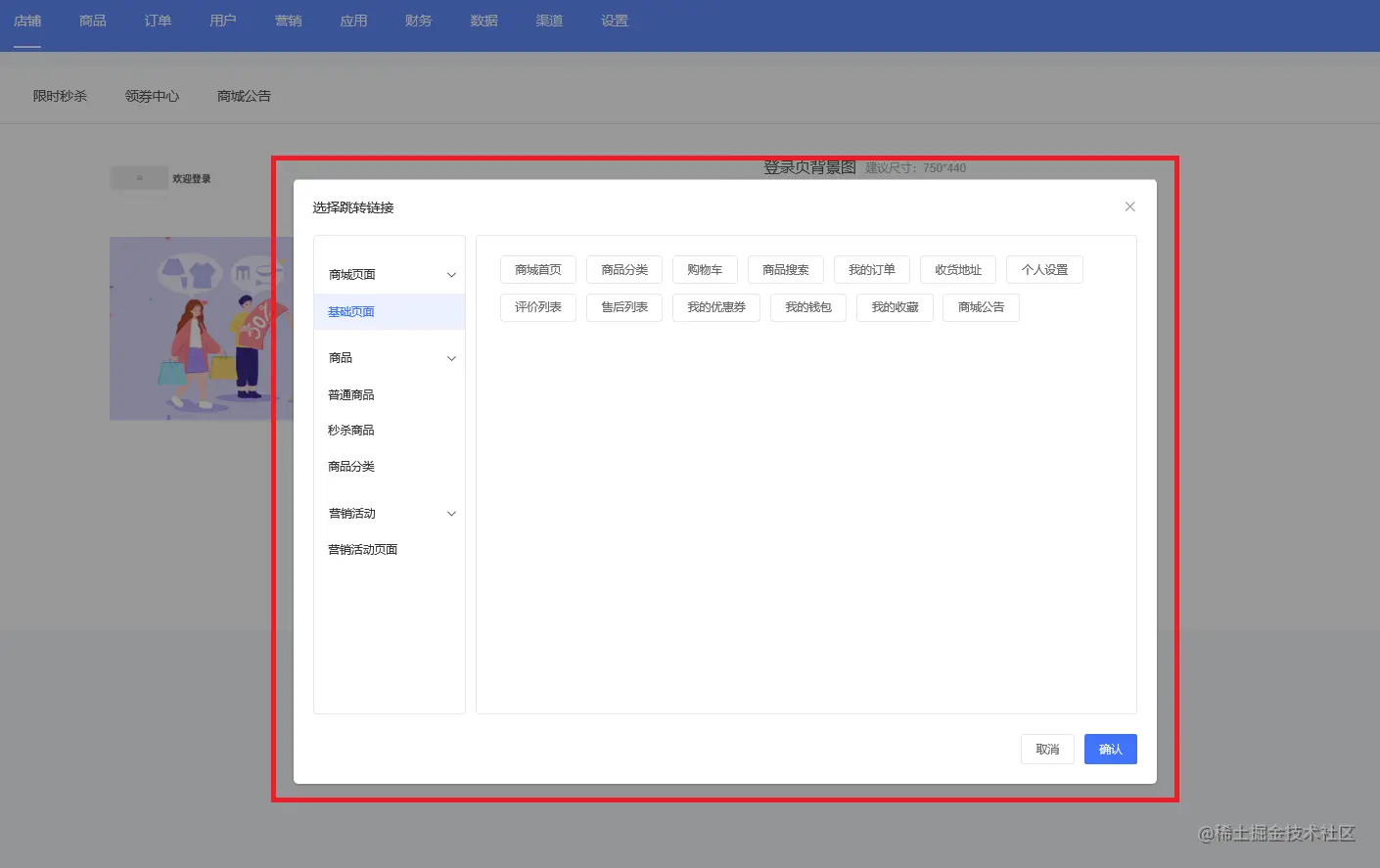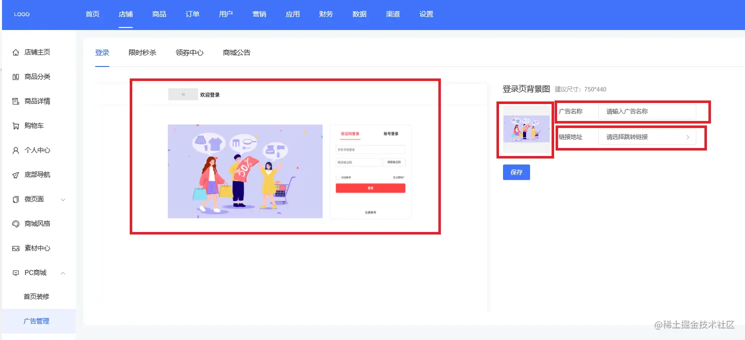 广告管理:有登录、限时秒杀、领券中心、商城公告等可以编辑图片、广告名称、链接地址等设置,如下图所示: