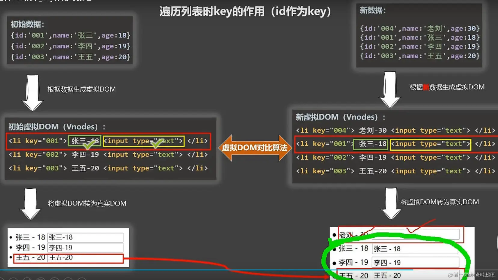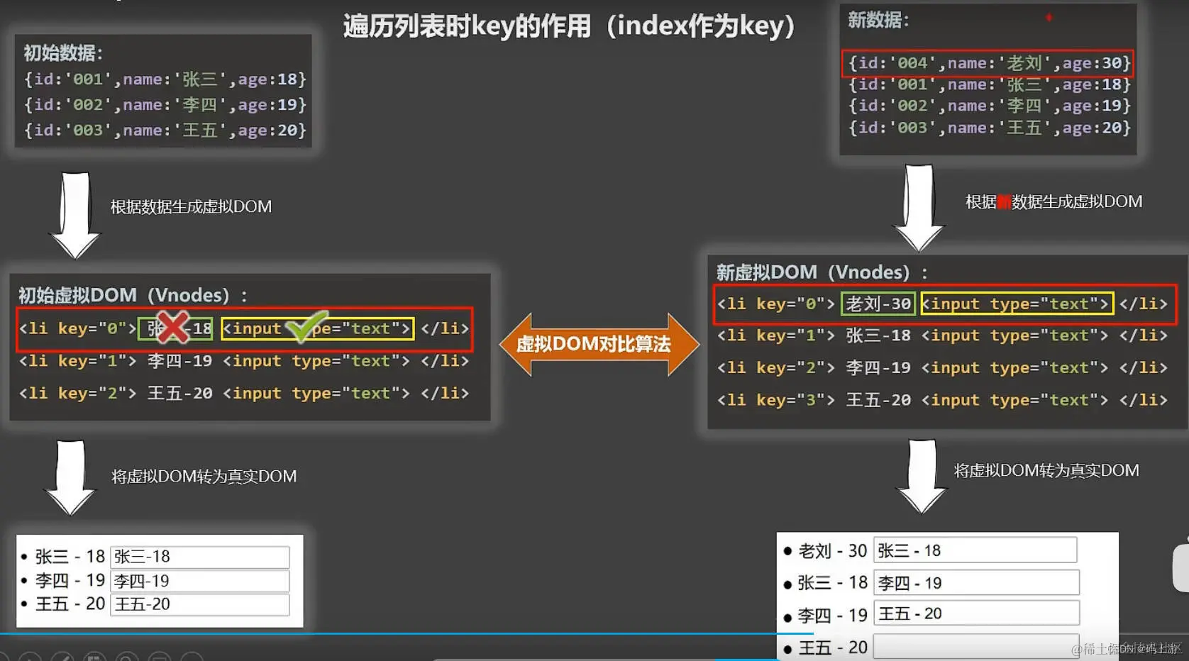 注意观察细节,上方的文字,一个是id作为key, 一个是index作为key。