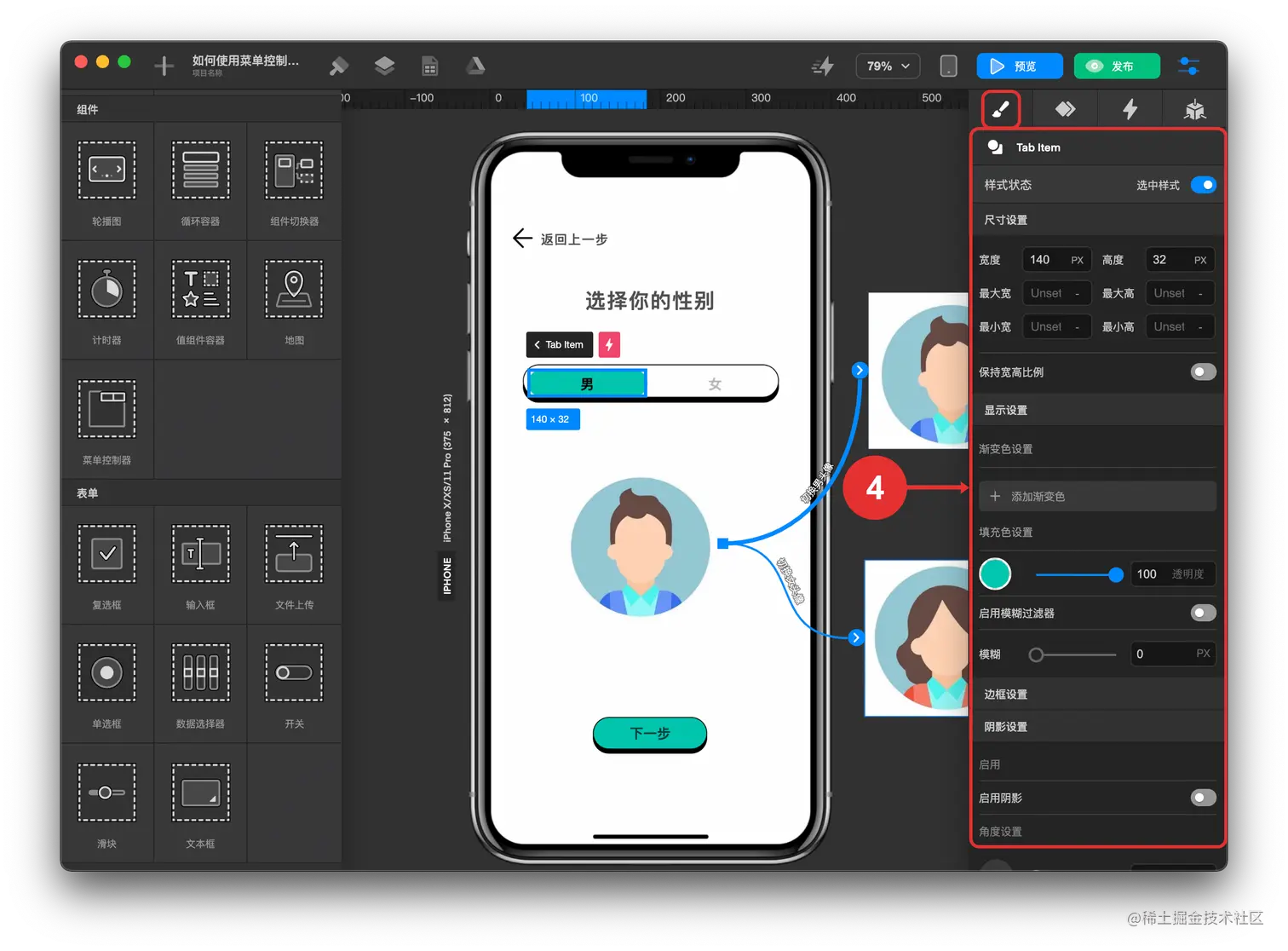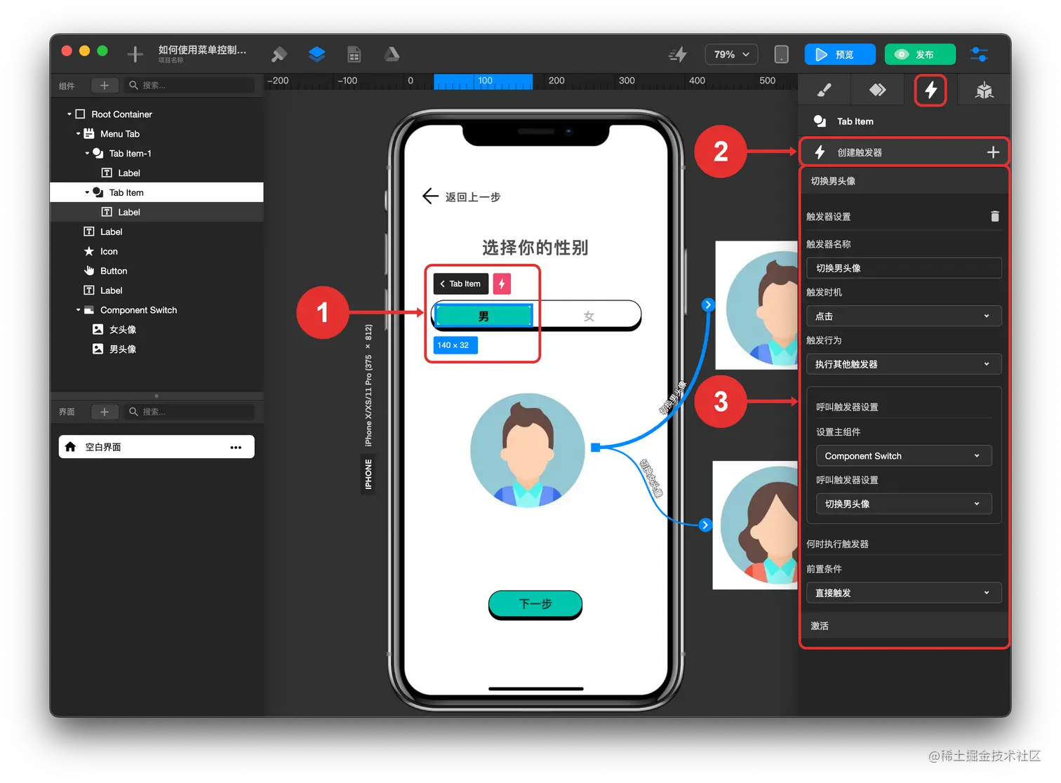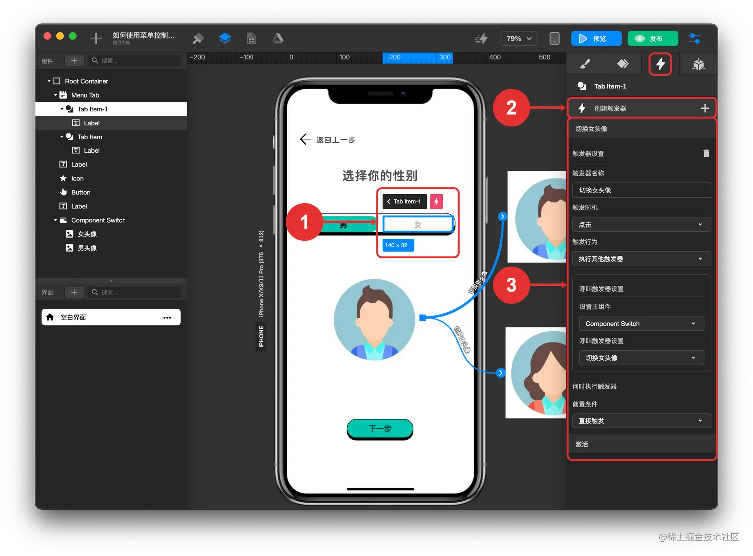 在某些使用场景下,你需要在菜单选项栏进行组件切换,例如底部导航栏、新手引导等场景。这时你可以使用 菜单控制器 和 组件切换器 配合来实现这一目的。
