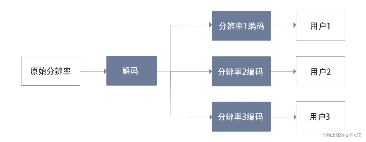 再者,我们在看视频或直播的时候,往往会根据当前网络状况选择不同的清晰度。这对应在服务端其实就是视频转码的过程,将原始视频解码过后,根据用户选择的不同清晰度进行编码。