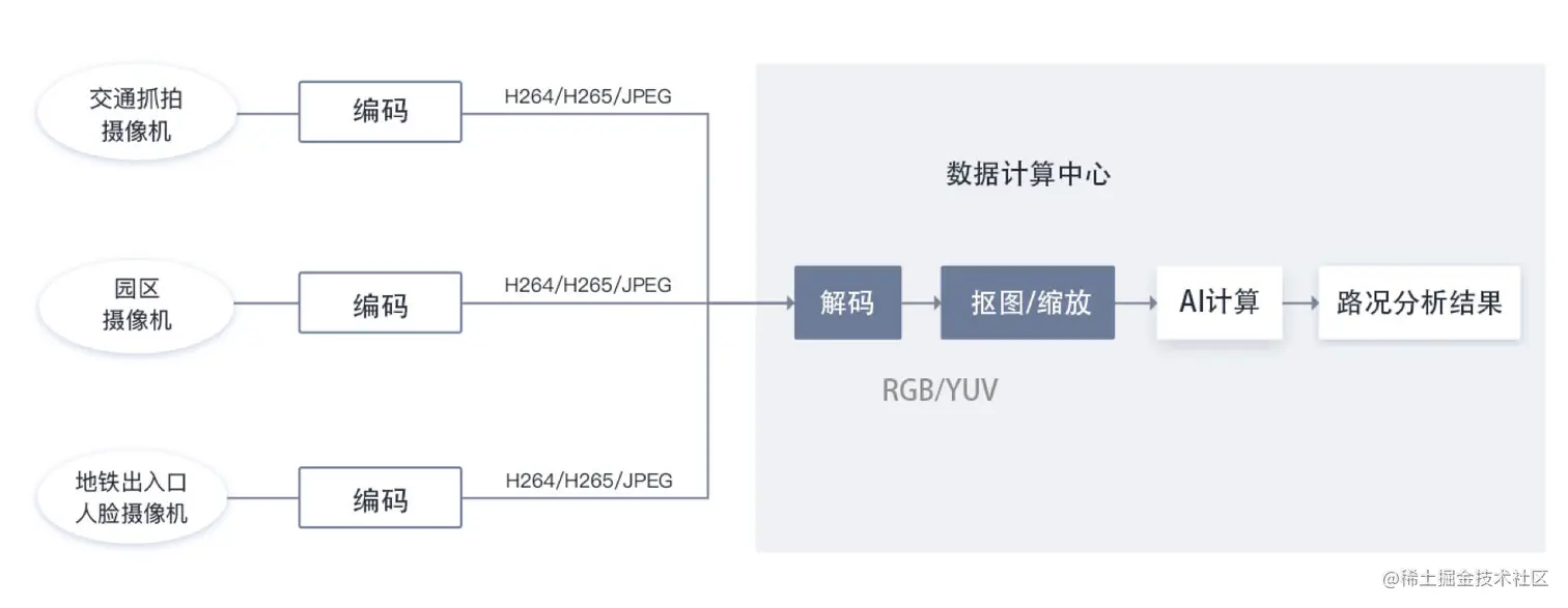 一般来说,摄像机采集的数据会通过网络传输到数据计算中心,而受制于网络带宽,数据计算中心获取的都是从各地的摄像头编码后的H264/H265/JPEG码流数据,要想进行AI智能分析,需要把数据解码成RGB/YUV格式,然后经过抠图、缩放等一系列预处理操作过滤出人脸、车辆等核心信息,最后送入AI计算单元得出实时路况分析结果。
