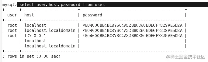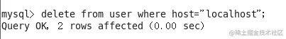其中有多余或没有user字段的host字段删掉,多余的字段host为localhost,使用命令delete from user where host="localhost";