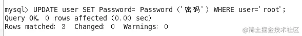 UPDATE user SET Password= Password ('密码') WHERE user='root'; # 将密码修改为root