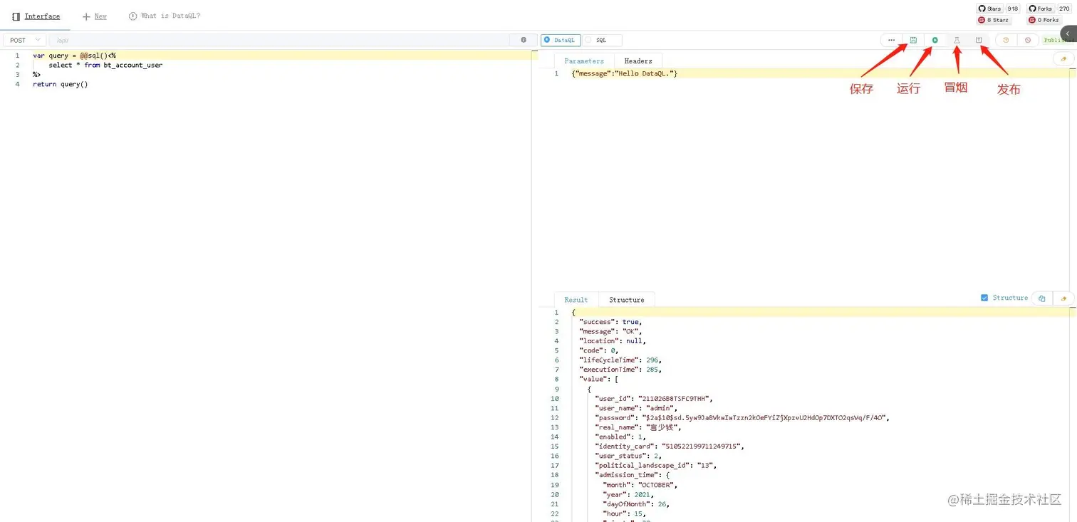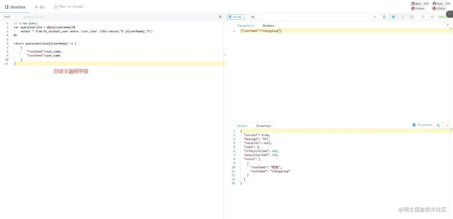 Dataway 是基于 DataQL 服务聚合能力,为应用提供的一个接口配置工具。使得使用者无需开发任何代码就配置一个满足需求的接口。整个接口配置、测试、冒烟、发布。一站式都通过 Dataway 提供的 UI 界面完成。UI 会以 Jar 包方式提供并集成到应用中并和应用共享同一个 http 端口,应用无需单独为 Dataway 开辟新的管理端口。这种内嵌集成方式模式的优点是,可以使得大部分老项目都可以在无侵入的情况下直接应用 Dataway。进而改进老项目的迭代效率,大大减少企业项目研发成本。Dataway 工具化的提供 DataQL 配置能力。这种研发模式的变革使得,相当多的需求开发场景只需要配置即可完成交付。从而避免了从数据存取到前端接口之间的一系列开发任务,例如:Mapper、BO、VO、DO、DAO、Service、Controller 统统不在需要。
