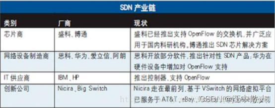 基于SDN架构,如果标准化了控制器和转发器之间的接口,比如OpenFlow协议逐渐成熟,那么网络设备的白牌化将成为可能,比如专门的OpenFlow转发芯片供应商,控制器厂商等,这也正是所谓的系统从垂直集成开发走向水平集成。