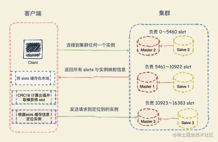 当客户端请求时,会计算出键所对应的哈希槽,在通过本地缓存的哈希槽实例映射信息定位到数据所在实例上,再将请求发送给对应的实例。