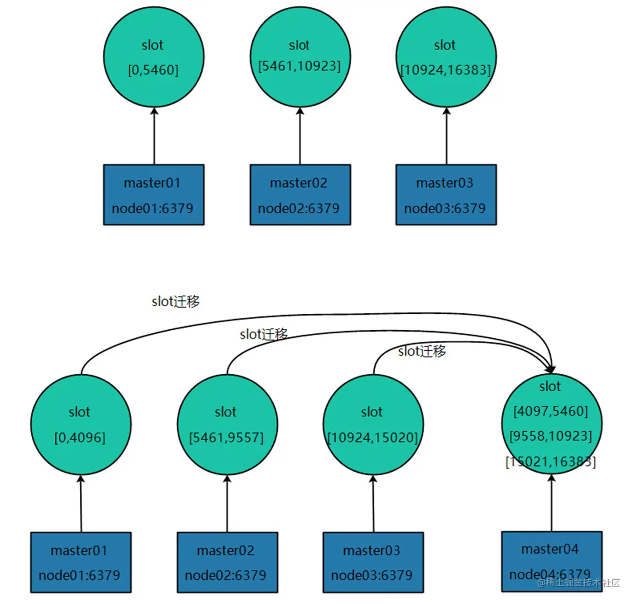 重新hash(node),分配和转移相应的slot给到新节点。