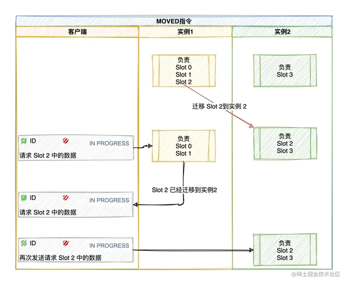 客户端将请求发送到实例上,这个实例没有相应的数据,该 Redis 实例会告诉客户端更新本地的哈希槽与映射信息的缓存,将请求发送到其他的实例上。