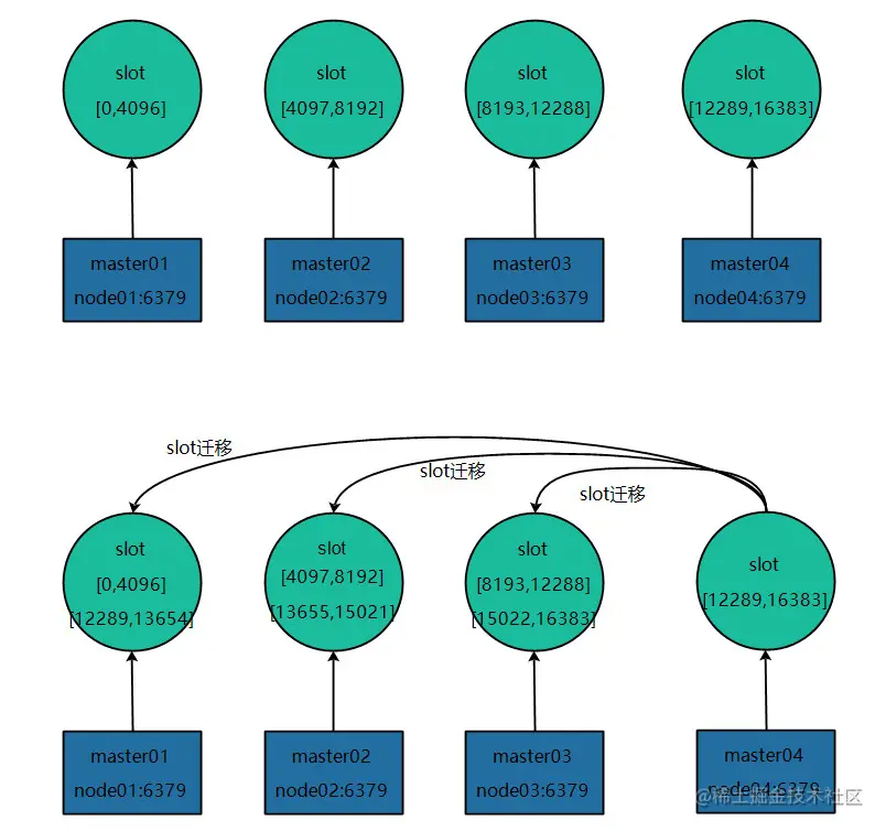 迁移所有的slot(应该被迁移的那些),所有的slot迁移完成后,新的集群的slot就重新分配完成了,向集群内所有master发送cluster setslot {slot_id} node {targetNodeId}命令,通知他们哪些槽被迁移到了哪些master上,让它们更新自己的信息。