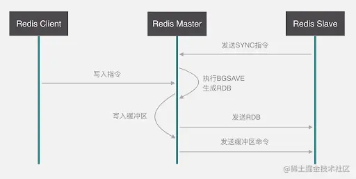 收到 sync 命令后,主服务器执行 bgsave 命令,用来生成 rdb 文件,并在一个缓冲区中记录从现在开始执行的写命令。