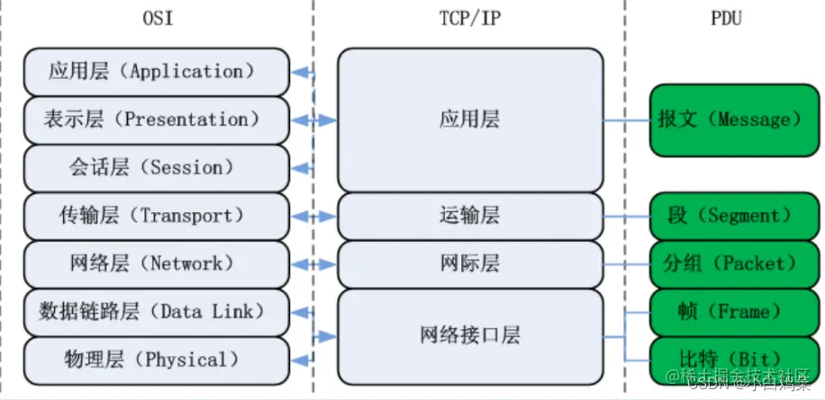 | 传输层 | 依赖物理层、数据链路层和网络层,任意一个网络节点都能把任何信息传递到其他任意节点,而传输层在物理层、数据链路层和网络层提供的节点间的通信能力基础上进一步提供了面向应用的服务。 |