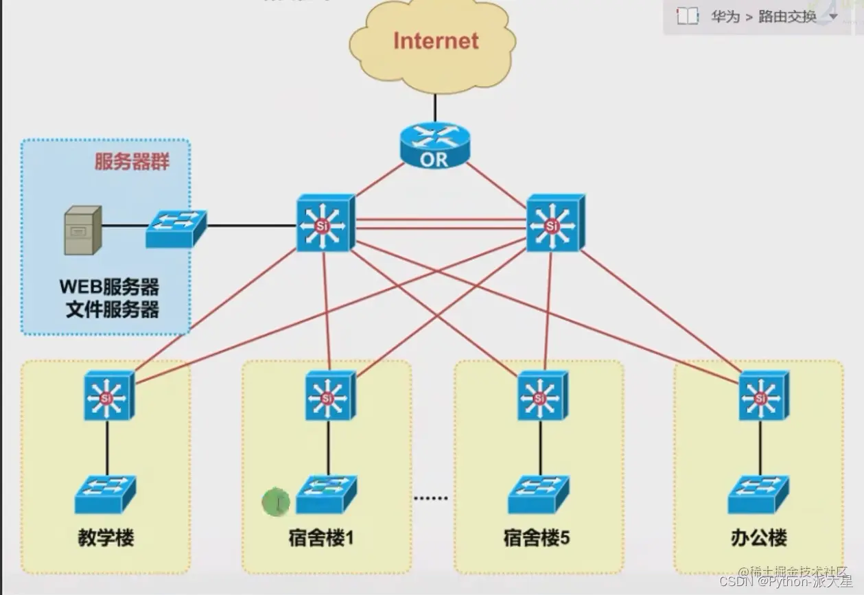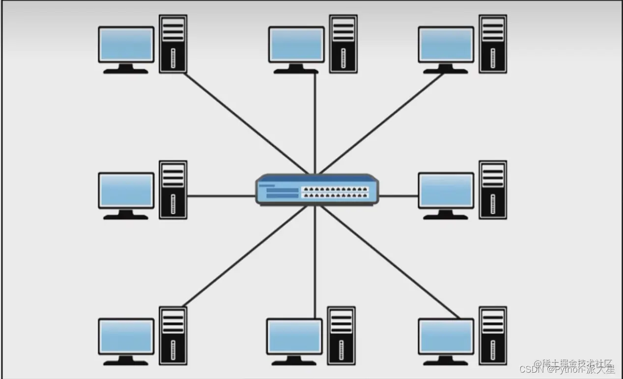 星形线路是典型的局域网架构,缺点是交换机挂了,其余全挂了,优点是,一台pc机坏了,其余的不影响。