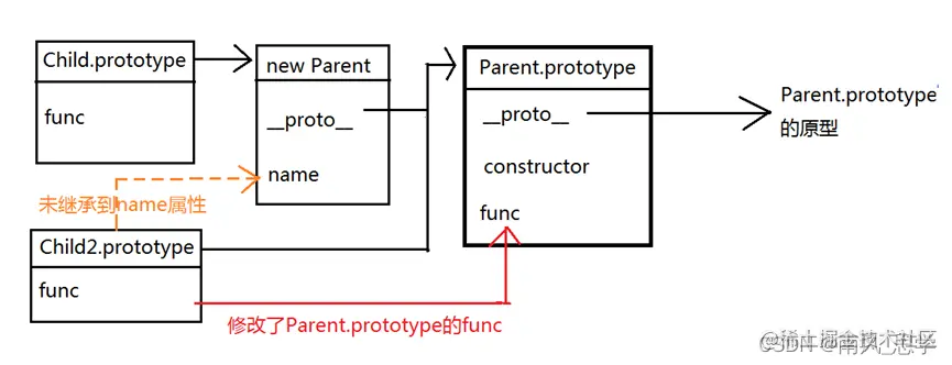 1.Child.prototype = new Parent() 会导致Child多个实例指向同一个引用,因为new Parent返回的是一个引用类型,此时修改Child的某个实例的属性,其它实例的属性也会被修改。