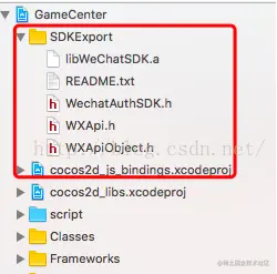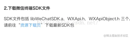 2,首先呢,我们进入微信开发者平台,选择到官方的ios 接入指南项,点击 “资源下载页”,下载 demo 。 然后把demo 中的SDKexport 文件直接拖入到你的Xcode 中,如下图: