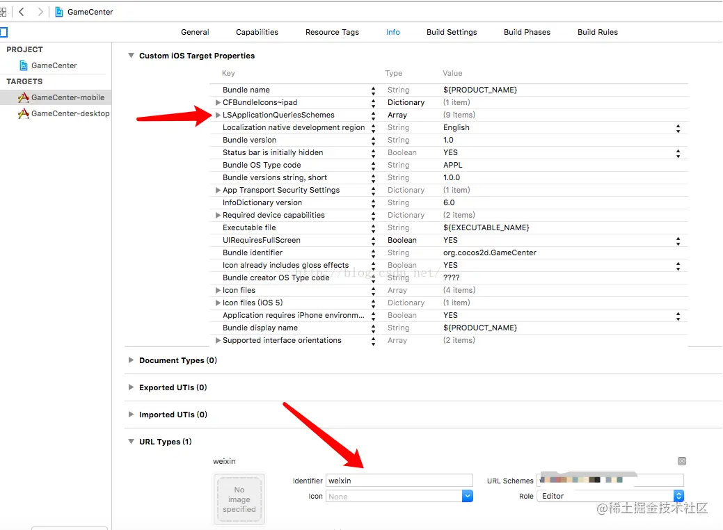 b),然后我们需要发送http请求,需要把发送的appid 加入白名单中,xcode 的新需求 。以及找到LSApplicationQueriesSchemes 添加key value 加入自己的aped,如图: