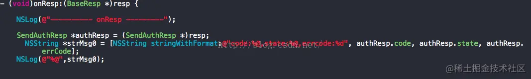 ( 第二张图的第一行代码是一个字符串对象的创建, 第一个参数是,你javascript文件名后面点 “ .” 的是文件中的方法及方法的参数, authResp.code 就是从微信中反馈过来的code了,拿到code 我们既可向微信交换 授权后的个人信息了。后面的是oc 调用js的方法了,这个cocosCreator上有相关的教程可以去找一下 )