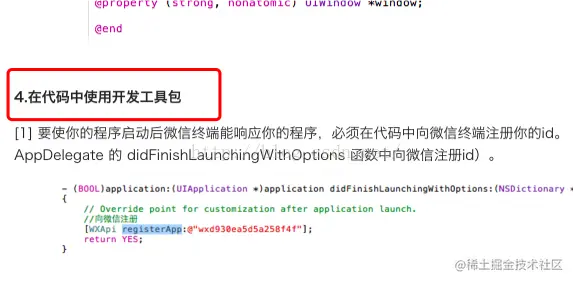 4,现在为止,我们开始修改代码部分及添加代码部分了!!! 先建议仔细阅读一下 ios 指南代码中的如下下图第四步。(因为我们需要按照它的的方式来做。)