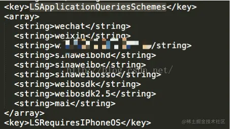 这个图是LSApplicationQueriesSchemes 的列表,圈住的地方是填入自己appID 。