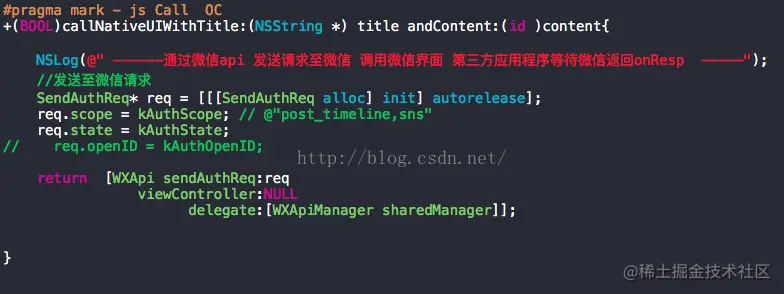 上图: 然后在该文件中再添加一个,js调用oc方法如图: 解析途中写了,就是先构建一个微信固定的数据结构,然后向微信发送请求,然后调用微信授权界面,当用户点击授权,即会返回至上面的onResq 方法,