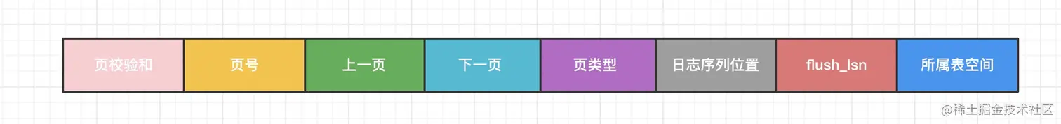 8个字节组成,前4个字节是页的校验和,与文件头中的校验和对应,后4个字节代表页面最后修改时对应的日志序列位置(lsn)。