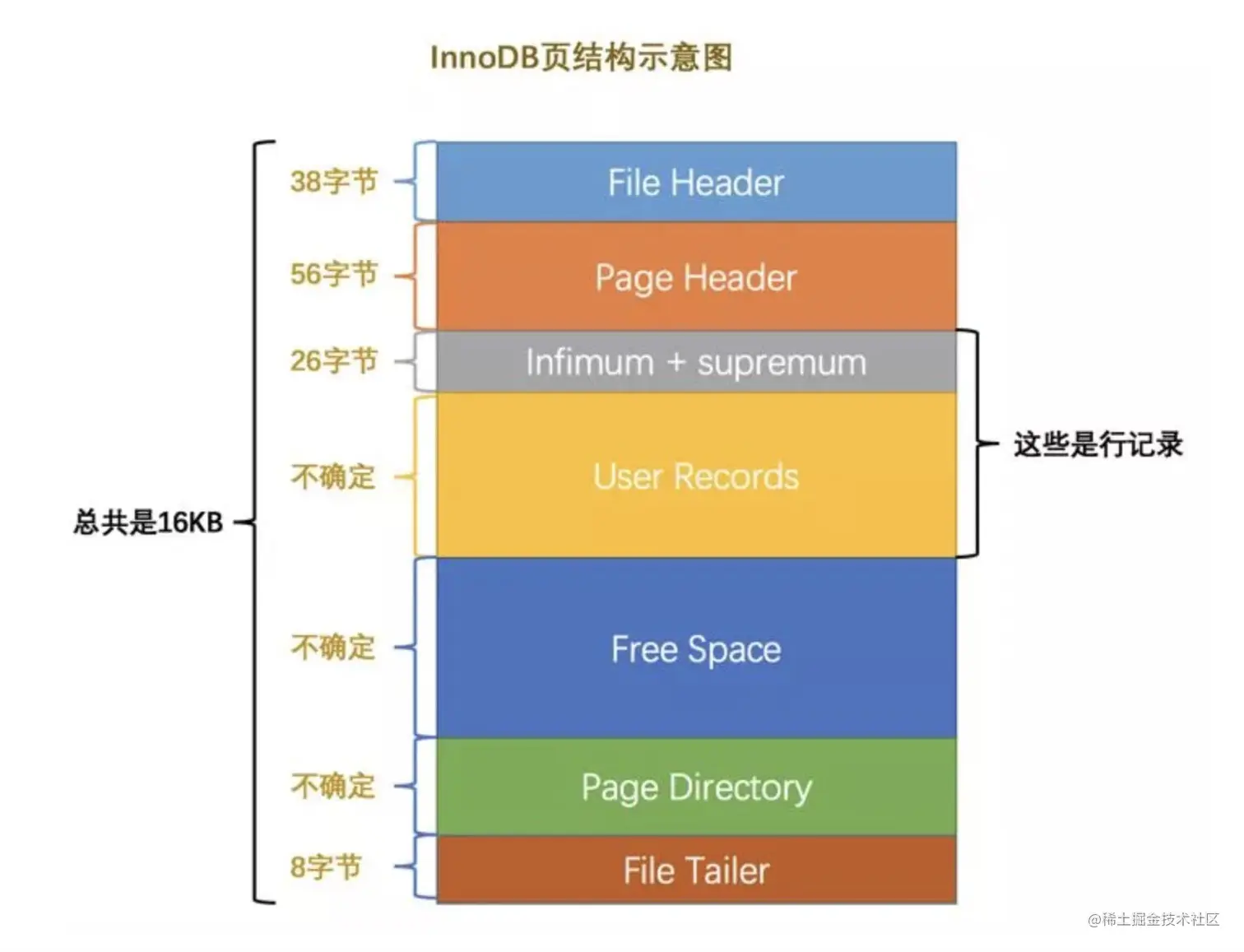 数据页被划分为7个部分,不同部分有不同的功能,下图为InnoDB数据页的结构: